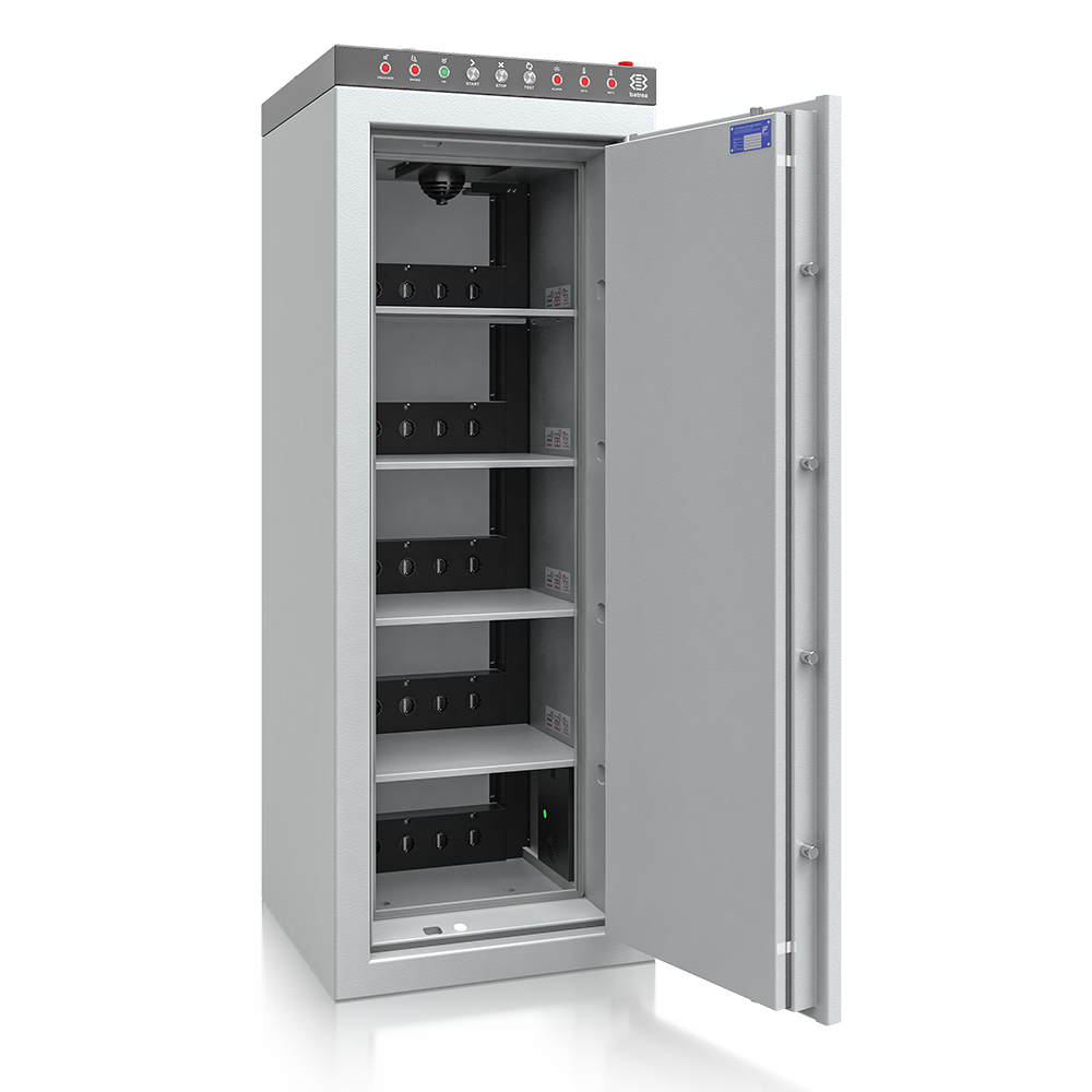De kluis heeft een ruim binnenformaat (1666 x 566 x 471 mm)(HxBxD) en toch compact genoeg (buitenformaat: 1918 x 711 x 702 mm ) om eenvoudig te plaatsen in technische ruimtes, werkplaatsen of opslagruimte.
