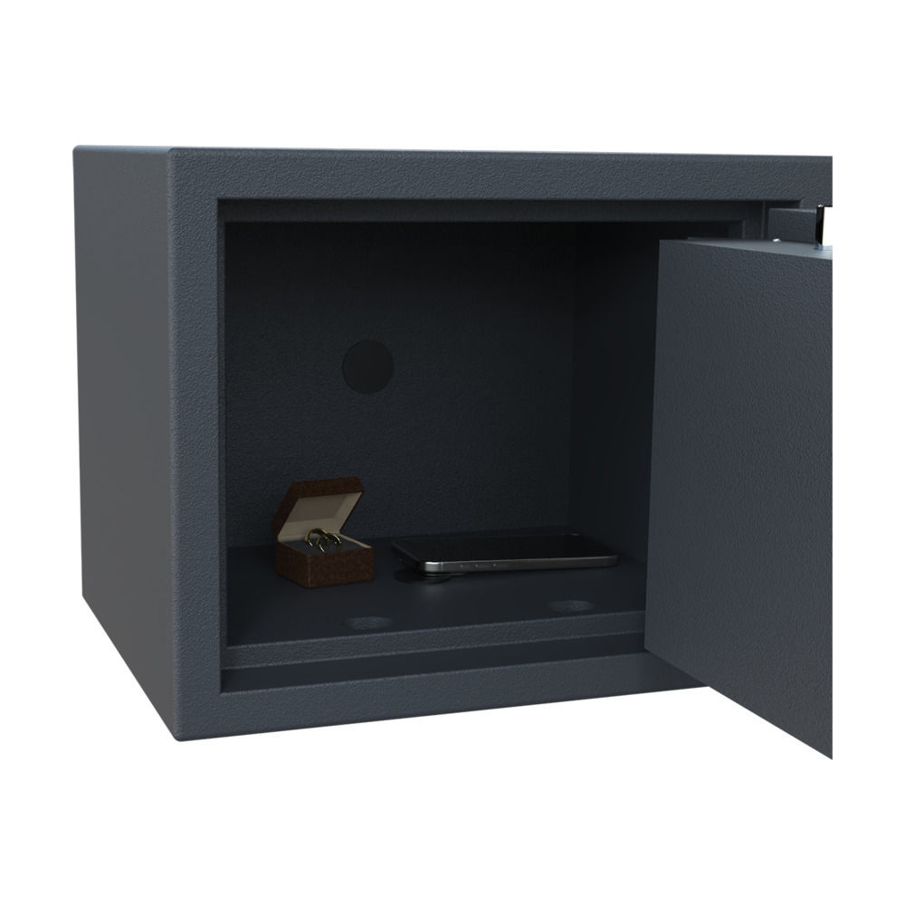 Ondanks z’n compacte afmetingen (350 x 440 x 350 mm) biedt hij bescherming volgens EN 1143-1 Grade III. Oftewel: een waardeberging tot € 90.000 voor sieraden of documenten.